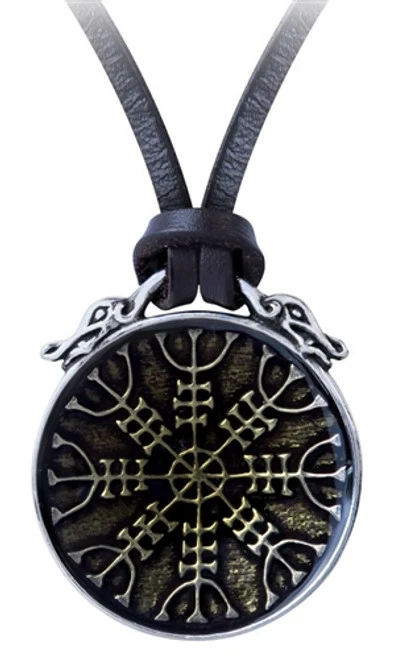 The Aegishjalmur Pendant by Alchemy, a 35mm diameter pewter disc covered with an embossed Viking / Icelandic stave rune set beneath a smoked, transparent enamel glaze. The hanger, to which the leather thong is attached, is finished with traditional style dragon’s heads.