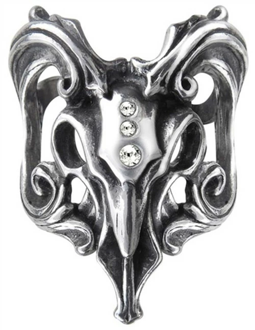 A polished pewter ring of a stylised ram’s skull with clear Swarovski crystals, floriate Baroque horns and set upon a split shank