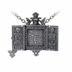An antiqued pewter photo locket in the authentic form of an Orthodox icon. Crested by vampire bats, the hinged doors display etched brass panels showing contemporary scenes of Vlad The Impaler. When opened, a portrait of Vlad, flanked by a skeleton on each door is engraved inside the photo frame which is 22mm wide by 23mm high. The locket is fastened closed by a magnetic catch.