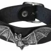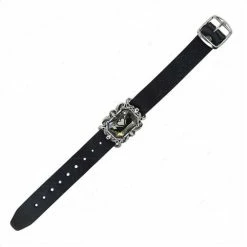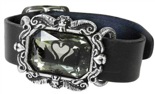 A bracelet made of a narrow black leather wrist strap with a buckle fastening, mounting an elaborate Victorian style pewter frame holding a large, black diamond Swarovski crystal, engraved from behind with a dual black swans heart motif.