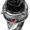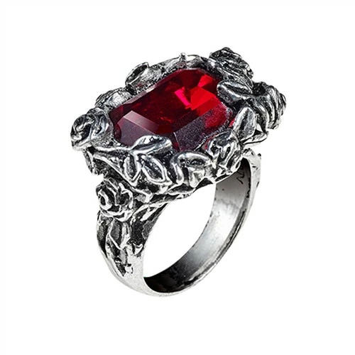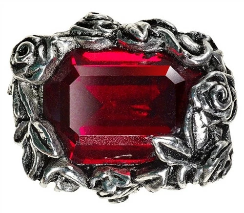 The blood red crystal, taken from the episcopal ring of a disgraced former cardinal, was re-set into a nest of roses by the devoutly pious jeweller to the king, to mystically redeem its virtuous properties.