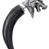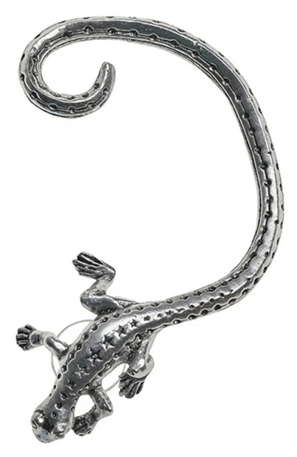 An adjustable, pewter earwrap of the mystical salamander, which wraps around the top of the left ear and is fitted with a surgical steel post and plastic butterfly for securing into a lobe piercing.