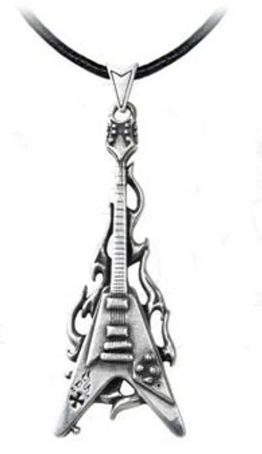 The iconic instrument of the rock and metal axeman is totally on fire! On black leather thong.