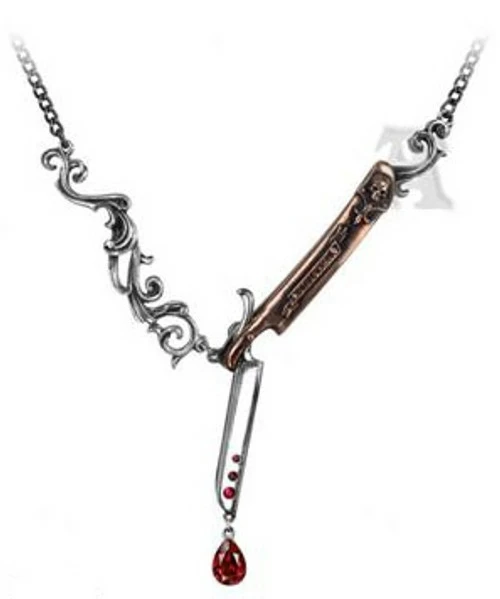 An elegant, if minacious masterpiece from the esteemed inventor of the 1740 cut-throat razor; the ‘propre radet’ scroll means ‘a close shave’. Articulated 2-tone pewter necklace with ‘blood drips’ of Swarovski crystals.
