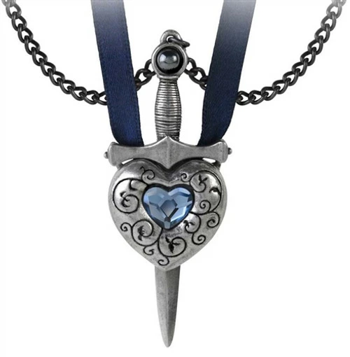 The sword withdraws from the Swarovski crystallised heart for the two to be worn separately as tokens of betrothal. A pewter ‘his & her’ betrothal necklace which splits into two separate pendants of a floral scroll-engraved heart set with a pale blue Swarovski heart crystal, suspended on a black satin ribbon, and a sword with a hematite cabochon on a black curb chain.