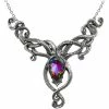 A large, elaborate symmetrical pewter necklace of Baroque scrolls set with three clear Swarovski crystals and a large, black resin rose at its centre above two small skulls, hung with draped trace chain and surmounted by two bat-winged cherubs; on a 7mm wide black satin ribbon fastened with an adjustable pewter slide, allowing a choker fitting or up to 34″ (86cm) long overall.