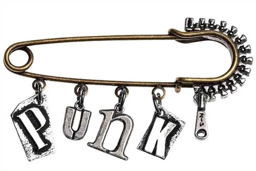 A large – 3″ (75 mm) – brass plated kilt/lapel pin, with pewter zip wrapping the pin head, and with the separate pewter letters ‘P U N K’ suspended below.