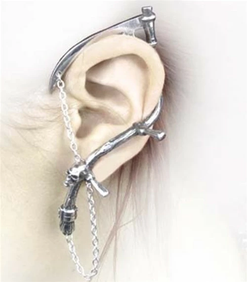 The Grim Reaper’s soul-taker, and symbol for the end of mortal life. The scythe wraps over the ear with the blade hooking over the top, and a stud securing it from the skull at the bottom.