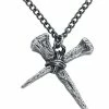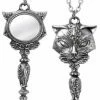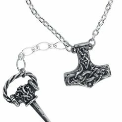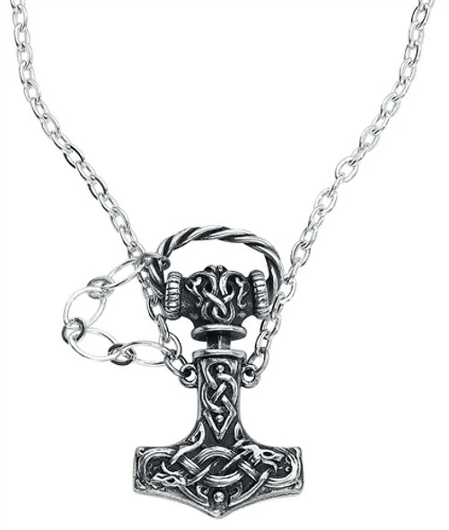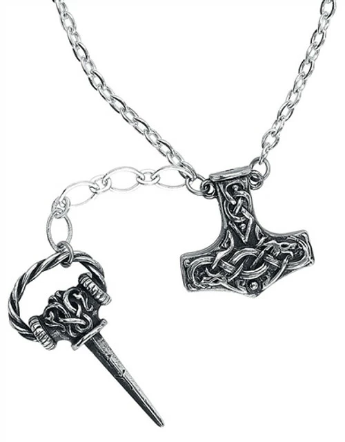 Thor Dagger Pendant by Alchemy has a small pewter dagger disguised as a classic Hammer of Thor pendant, highly decorated with carved Celtic knotwork and runes upon its surface. The knop, (attached to a safety chain), can be withdrawn to reveal the small engraved blade.