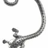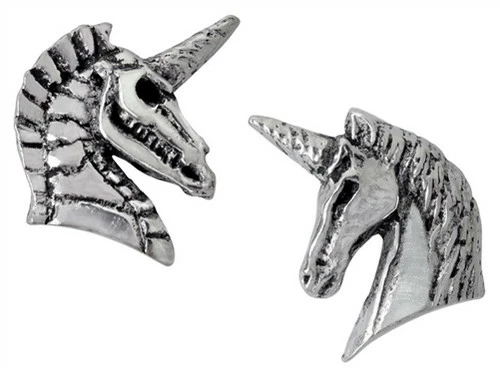 A pair of complimentary pewter unicorn’s head profile ear studs, one natural and the other an armored skeleton. With surgical steel ear posts and plastic scrolls.