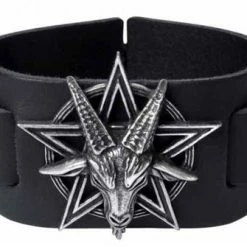 This Leather Wriststrap by Alchemy is a pewter pentagram charm upon a 20mm wide black leather wriststrap; adjustable, and fastened by a buckle.