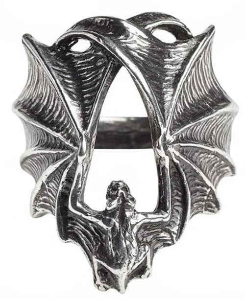 A large, antiqued pewter ring in the form of a creeping bat, with enormous outstretched wings covering the finger.