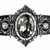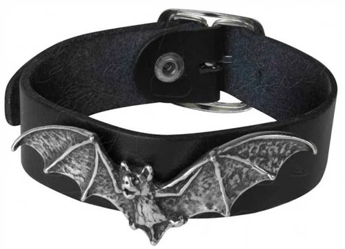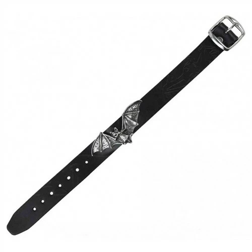 A narrow black leather wrist strap with a buckle fastening and fitted with a dark pewter bat, in full flight.