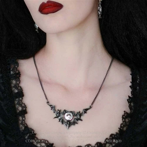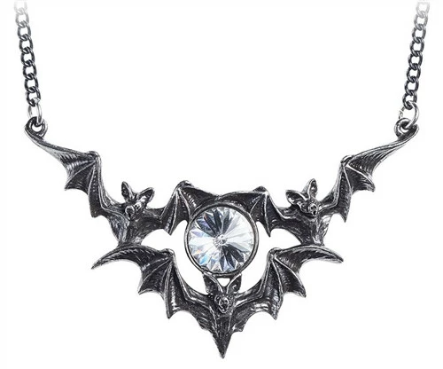A triangular pewter necklace of a trio of dark bats with, at the centre, a clear 14mm round Swarovski crystal.