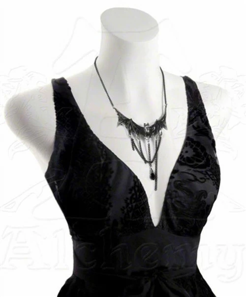 A faded dark pewter necklace of a ragged, spreadeagled, swooping bat with asymmetrical black chains and a Swarovski black crystal teardrop suspended from the wingtips.