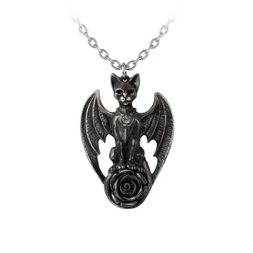 Alchemy Guardian of Soma Pendant is a statuesque winged black cat inlaid with a black diamond Austrian crystal and large acrylic black rose. Handmade with care in blackened pewter with hand polished highlights that shimmer in the light.
