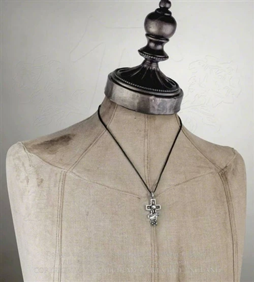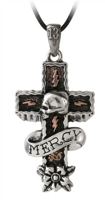 An antiqued, two-tone pewter pendant of a stone-fashioned cross with a profiled skull in the centre, “Mercy” scroll below and rose head beneath, and a bronzed inset with lightning bolt motifs; suspended from a bale.
