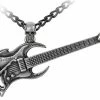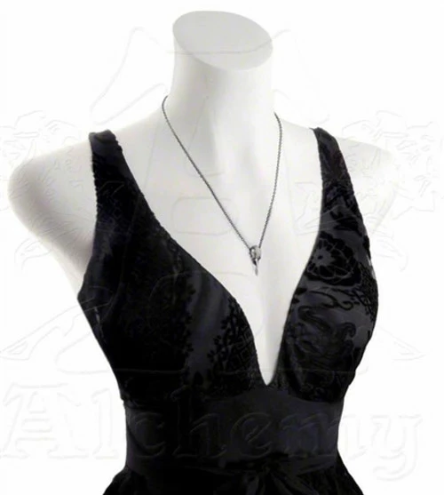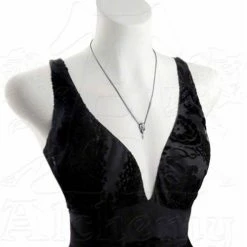 An authentically detailed miniature raven’s skull pendant in polished pewter, suspended by the chain passing through the skull’s eyes.