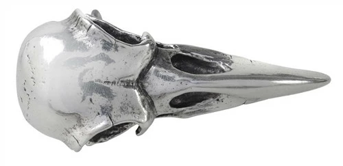 A large, authentically detailed raven’s skull, in antiqued pewter with hand polished beak.