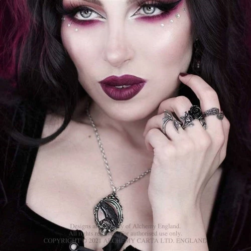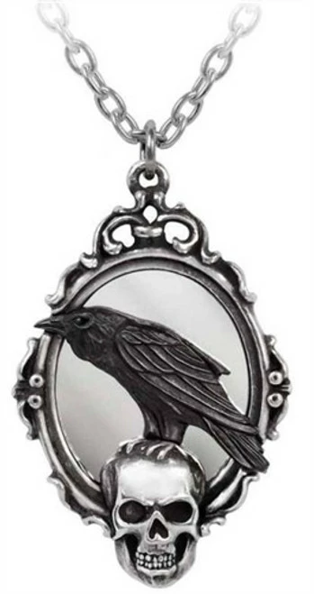 Alchemy Reflections of Poe Pendant is a stunning mirror pendant with ornate frame featuring a polished skull. Inlaid with a contrasting jet black raven it comes on a nickel free chain