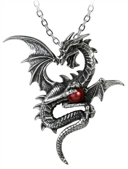 A large, 3D, polished pewter pendant of a writhing dragon clutching a lustrous, burgundy red Swarovski pearl.