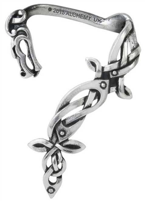 A polished pewter Celtic style knotwork dragon wrapping around the ear, the head appearing from behind the top of the ear. Can be gently bent to comfortably fit your own ear; fastened with one surgical steel ear-post.