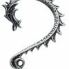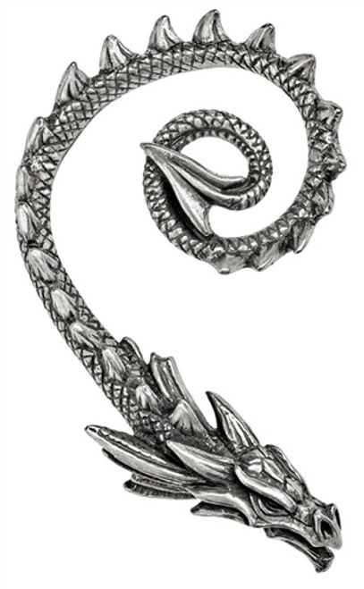 A polished pewter dragon wrapping around the ear, with its pointed tail at the top and its head at the foot; surgical steel ear-post. For the right ear.