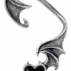 This Alchemy Elvyn earwrap is a pointed elf-ear-shaped ear-wrap in black pewter of delicate scrollwork neatly framing the ear and set with two large, red Swarovski – can be gently squeezed to comfortably fit your own ear; fastened at the lobe with one surgical steel ear-post.