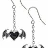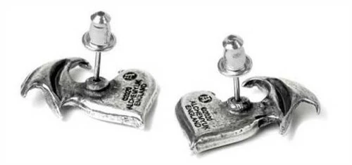 A miniature left and right pair of antiqued pewter black-enamelled heart ear-studs with one sided bat wings.