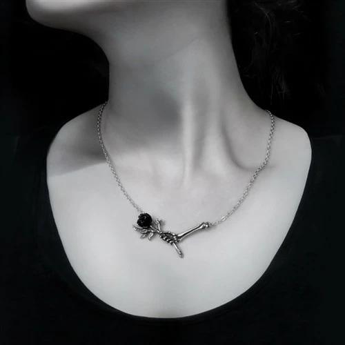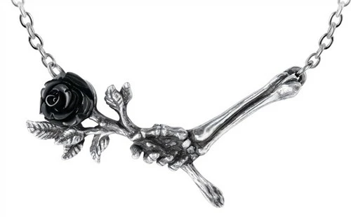 A fine pewter necklace of a skeletal hand offering a single black rose, with a black resin flower and on a split chain 51 cm overall.