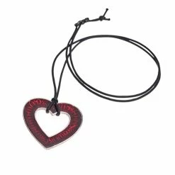 A large, pewter heart-shaped doughnut-ring pendant, with the raised Latin lettering ‘Superest Amore Etiam In Morte’ set under a transparent purple enamel, (transcribed upon the back), and suspended by a looped black wax cord, adjustable by a black pewter slide adjuster/fastener, up to 71 cm overall length.
