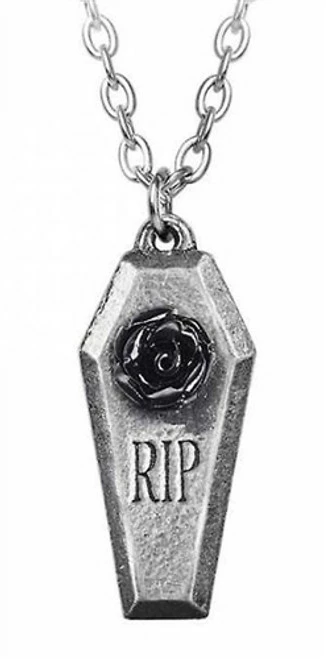 RIP Rose Pendant by Alchemy is a small pewter coffin lid-shaped pendant engraved with ‘RIP’ and set with a black resin rose flower. On a fine 46cm trace chain..