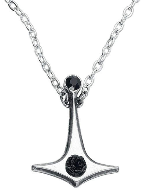 Thor’s Rose Pendant by Alchemy is a small pewter Hammer of Thor pendant set with a black Swarovski crystal and a black resin rose flower.