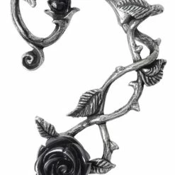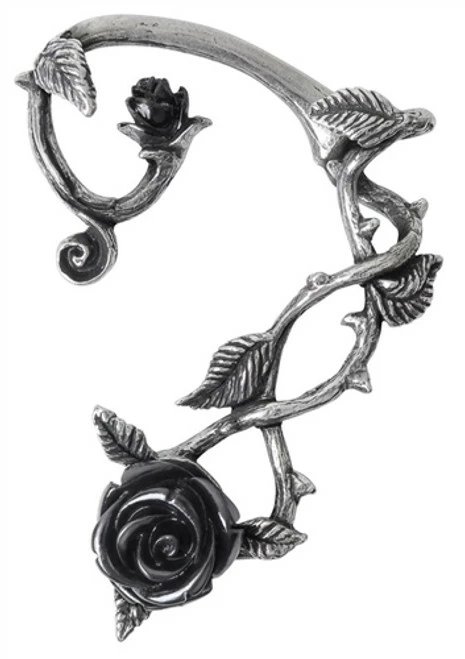 A polished pewter twine of wild roses wrapping around the ear, with black resin rose at the foot; surgical steel ear-post. For the left ear.