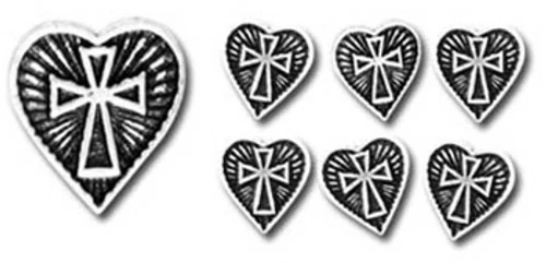 Pewter fancy shirt button trims in packs of 6, sewn-on with black thread through a pair of subtly placed thread-holes.