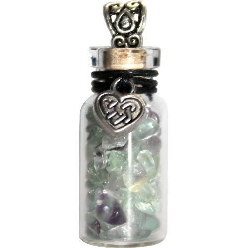 A glass bottle filled with Fluorite crystal chips and decorated with a celtic heart charm – ideal for developing intuition and seeking clarity – or use for your own associations