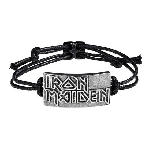A 38mm wide black leather wrist strap with a cast antiqued English pewter link-plate of the Iron Maiden logo; adjustable length, fastened with a steel buckle