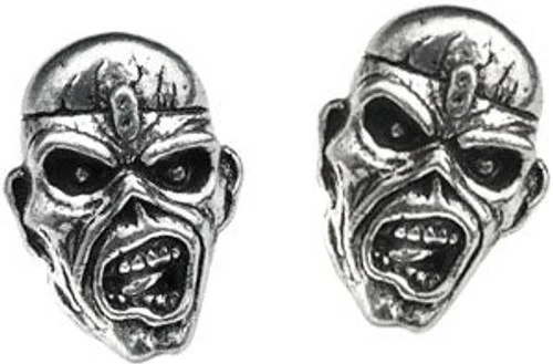 A pair of 3D sculpted ear studs based on the restrained Eddie’s head; English pewter earrings. Taken from Derek Riggs’ sleeve artwork of their 1983, fourth studio album, “Piece Of Mind”, where Eddie is shackled inside a padded cell.