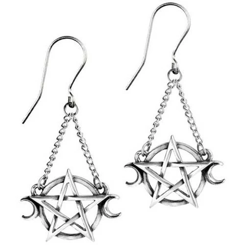 A delicate pair of pewter dropper earrings depicting a pentagram with small crescent moons either side, suspended from fine chain.