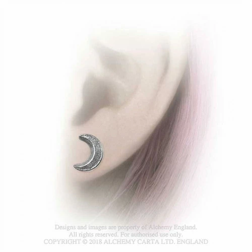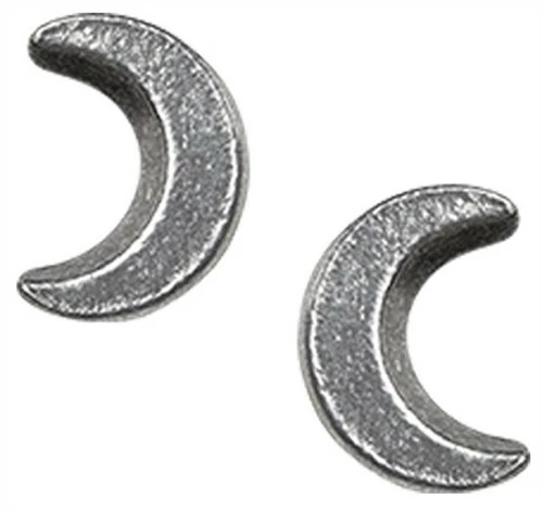 A pair of small, simple pewter ear-studs in the form of a crescent moon, on surgical steel stud ear-posts