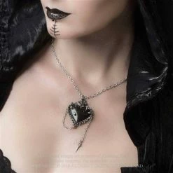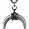 An antiqued pewter pendant of a crescent moon and beneath it a black onyx disk engraved with a Wiccan pentagram.