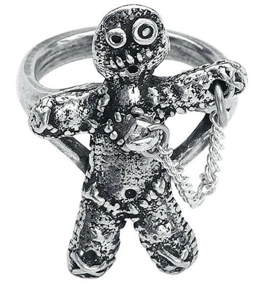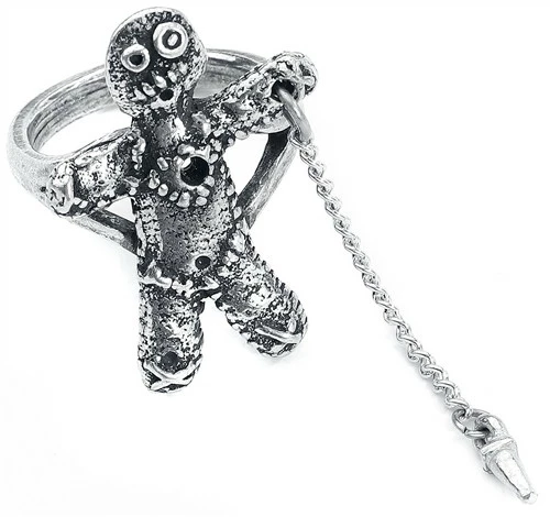 The Voodoo Doll Ring by Alchemy is a pewter ring of a miniature voodoo doll with a peg-hole at the heart and a removable peg-pin (on a fine safety chain), to stick the doll with