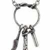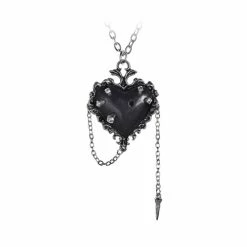 A pendant of a pillowed black pewter heart within a fine, decorative pewter frame, the heart pinned with five pewter nails with a sixth loose on a chain, which can be stuck into the vacant hole. A further decorative chain hangs on the opposite side.