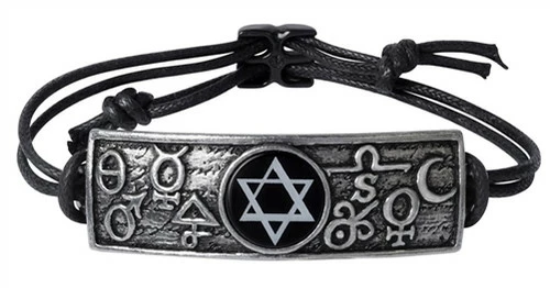 A talismanic magic tablet device for assisting in the achievement of the the alchemist’s magnum opus, the ‘great work’, incorporating sigils of the principle constituents required for alchemical transmutation; sun, moon, spirit, salt, sulphur and mercury, and a Solomon’s Seal formed by the unity of the four elements engraved upon its natural black onyx focal disc.