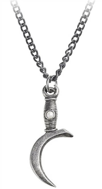 A small pewter pendant of a ceremonial Wiccan sickle, with a small mother-of-pearl cabochon set in its handle.