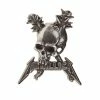 A 38mm wide black leather wrist strap with a cast antiqued English pewter link-plate of the Metallica logo; adjustable length, fastened with a steel buckle.