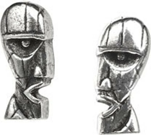 A pair of 3D sculpted heads from the Division Bell album cover; English pewter stud earrings. From Storm Thorgerson’s ‘Division Bell’ cover design; the giant heads were constructed and erected near Ely for the photo-shoot that was to become the 1994 album art.