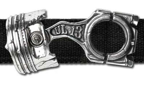 This authentically sculpted ‘broken piston’ buckle features an articulated ‘piston head’, around a modelled skull ‘pin’. With raised & etched UL13 branding. Supplied on 1½” black web belt.