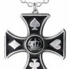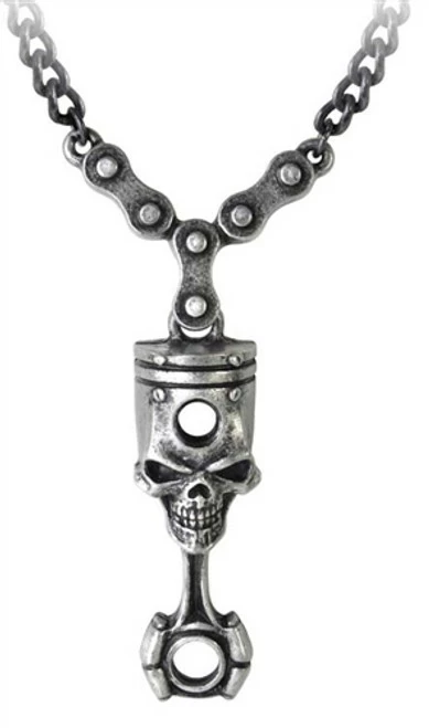 A pewter, motor engine’s skull-piston pendant complete with con rod and big end, suspended from a three link timing chain bale and on a 53cm black chain.