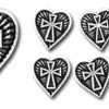 Pewter fancy shirt button trims in packs of 6, sewn-on with black thread through a pair of subtly placed thread-holes.